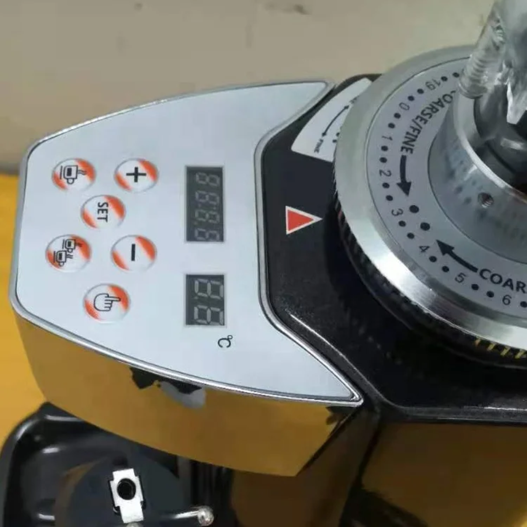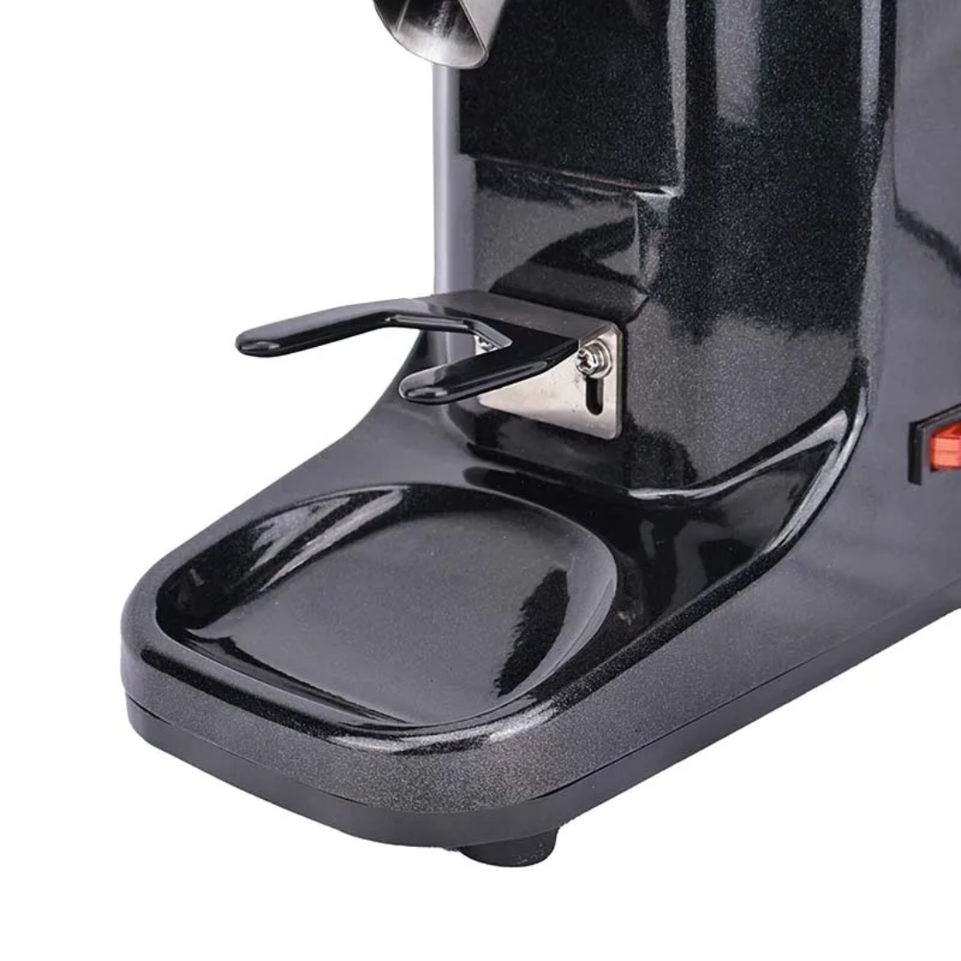 Electric digital coffee grinder , Flat burr 60mm , 250 watt , aluminium alloy . Metal portafilter base . Can set time for single or double espresso.